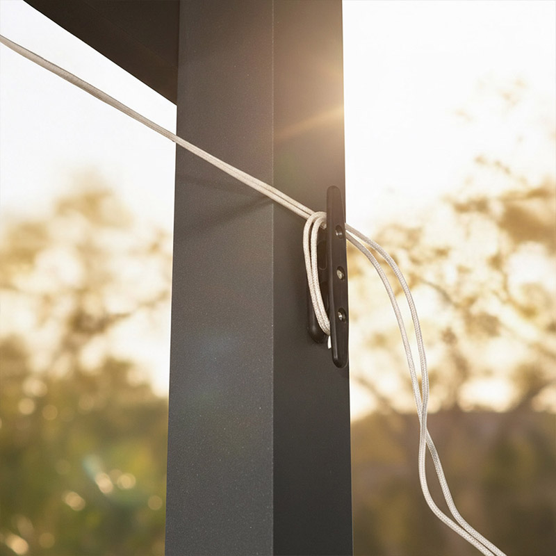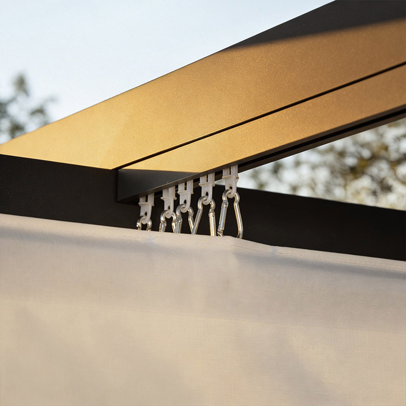 Die Konstruktion des SANTORA ist auf Beständigkeit ausgelegt. Ein massiver Stahlrahmen mit großzügig dimensionierten Hauptrohren (60 x 60 mm) sorgt für die nötige Standfestigkeit. Dank der hochwertigen Pulverbeschichtung ist das Gestell effektiv vor Korrosion und Witterungseinflüssen geschützt, sodass Sie lange Freude an Ihrem Pavillon haben.