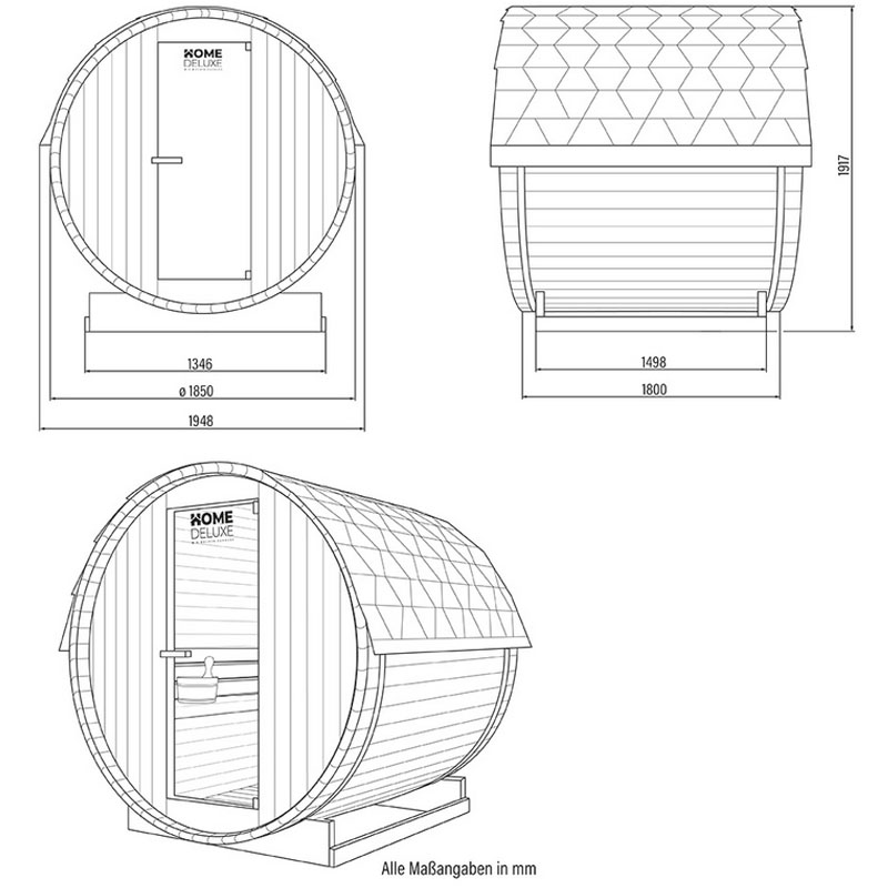 - Die Abbildungen zeigen die Fasssauna im behandelten Zustand. Die Fasssauna wird unbehandelt ausgeliefert.