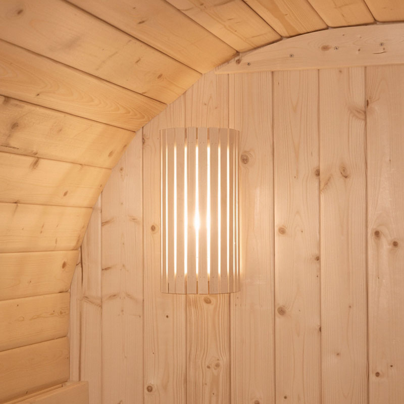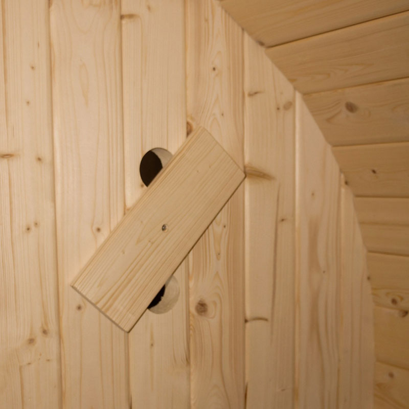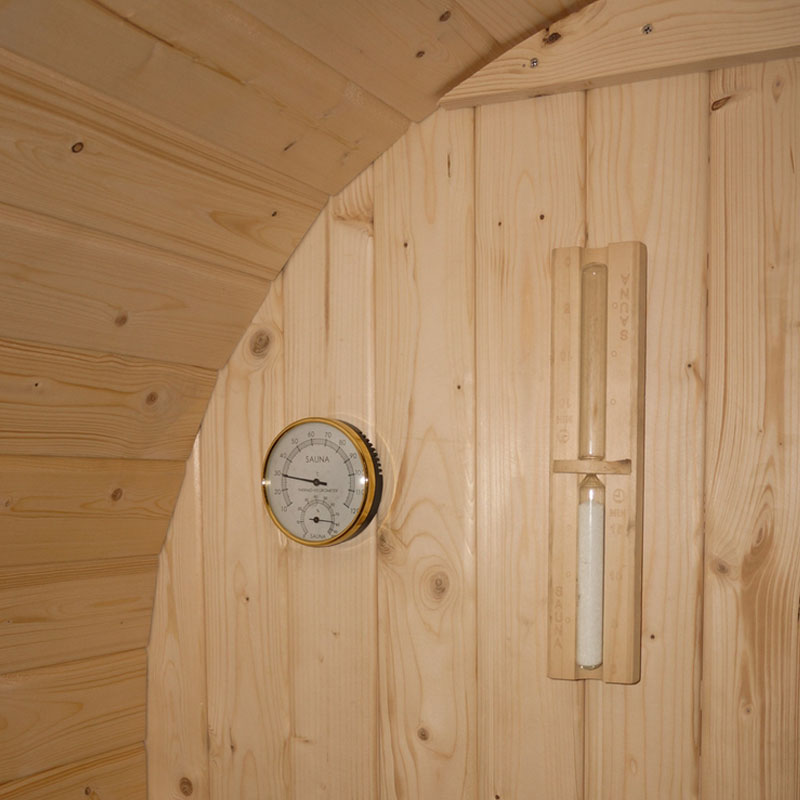 Die Fasssauna ist nicht nur ästhetisch ansprechend, sondern auch funktional. Mit einer Wandstärke von 38 mm sorgt die Sauna dafür, dass die Wärme im Inneren gehalten wird, während die Außenseite kühl bleibt. Diese Eigenschaft minimiert den Energieverbrauch und schont gleichzeitig die Umwelt.