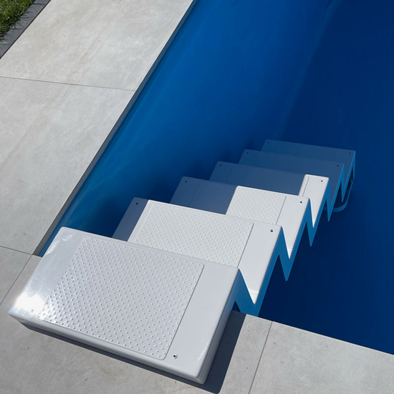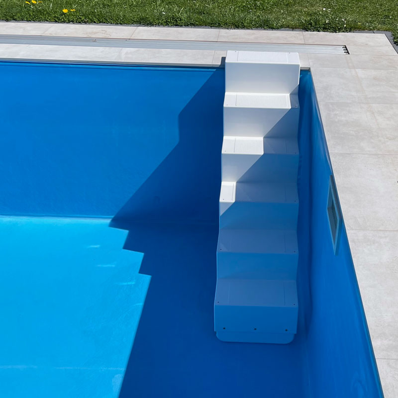 Diese Treppe nimmt wenig Platz in Anspruch, sieht elegant aus und bietet Ihnen die Möglichkeit zum einfachen Ein- und Ausstieg aus Ihrem Becken. In hochwertiger Handarbeit wird die Treppe aus Epoxy-Acrylat und Glasfiber hergestellt und steht für modernes Design mit gleichzeitig absoluter Funktionalität und Stabilität.