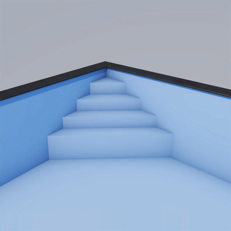 Fertigungsbedingt kann die Poolfolie im Bereich der Treppe nicht mit 90° Ecken produziert