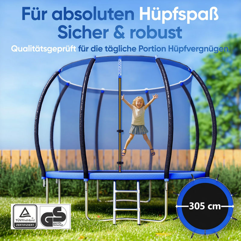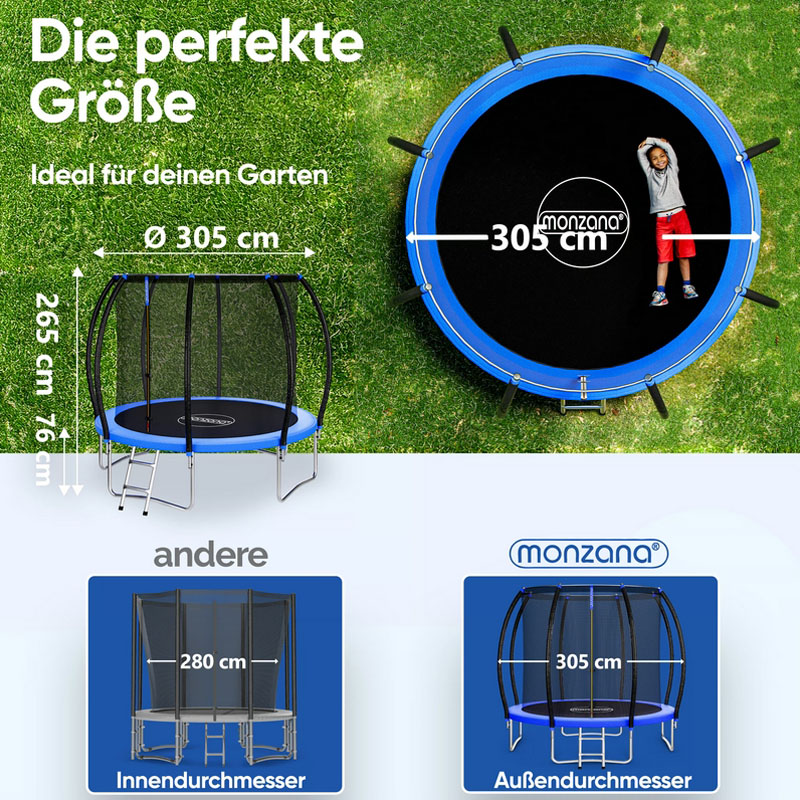 Erfüllen Sie den Traum vom eigenen Trampolin im Garten! Das MONZANA® Trampolin bietet sicheren Hüpfspaß für Kinder und Erwachsene. Mit seinem innenliegenden Sicherheitsnetz, der stabilen Konstruktion und der TÜV GS-Prüfung ist es die perfekte Wahl für unbeschwerte Stunden im Freien.