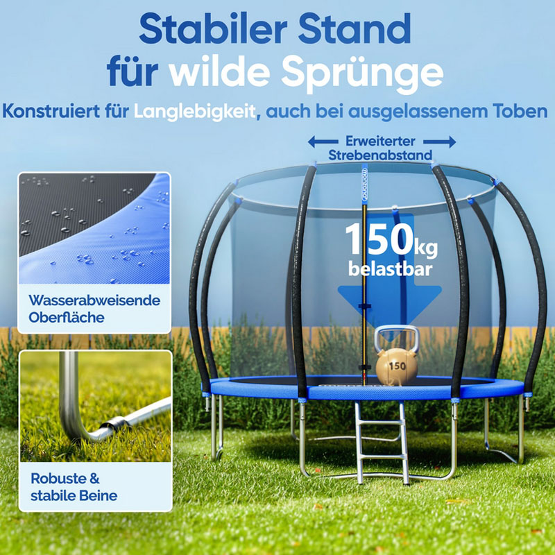 Das Trampolin verfügt über ein innenliegendes Sicherheitsnetz mit Doppelklickverschluss, das ein Herausfallen verhindert. Die verzinkten Stahlfedern und das stabile Stahlrohrgestell sorgen für maximale Spannkraft und Stabilität. Die w-förmigen Standbeine gewährleisten einen sicheren Stand.