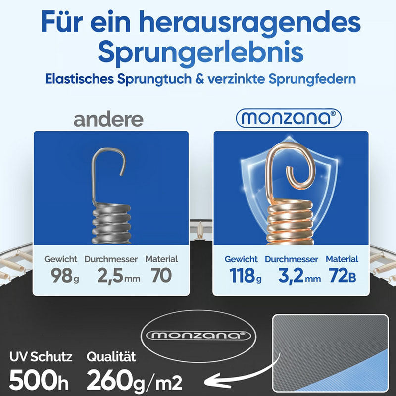 Herkömmliche Trampoline bergen oft Risiken durch fehlende Sicherheitsvorkehrungen und instabile Konstruktionen. Das MONZANA® Trampolin löst diese Probleme und bietet Ihnen ein sicheres, stabiles und hochwertiges Trampolin für die ganze Familie.